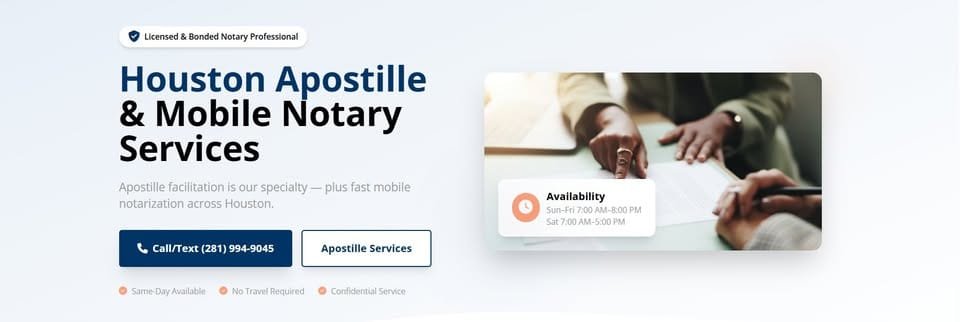HTX Apostille & Mobile Notary Services provides seamless and professional notarization across the Houston area. Our dedicated team delivers reliable notary expertise directly to your chosen location, whether it’s your home, office, or hospital. We handle a variety of legal documents, from powers of attorney and affidavits to real estate paperwork and wills, ensuring accuracy and confidentiality with every signature. HTX Apostille & Mobile Notary Services saves you valuable time and stress with our flexible scheduling and dependable, friendly service. We are your ideal partner for all your notarization needs, providing expertise and convenience right where you need it.